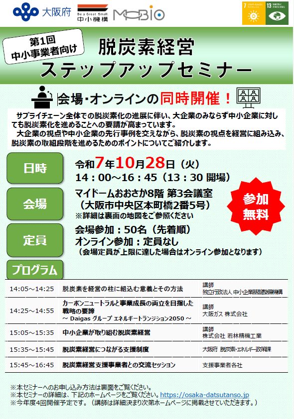 第1回「脱炭素経営ステップアップセミナー」inマイドームおおさか【10/22締切】