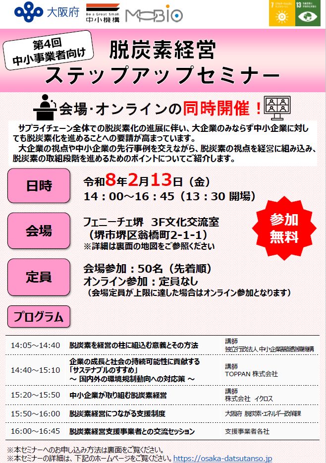 このたび、大阪府では府内事業者の皆様を対象に参加費無料の「第4回脱炭素経営ステップアップセミナー」を開催しますので、ご案内いたします。
